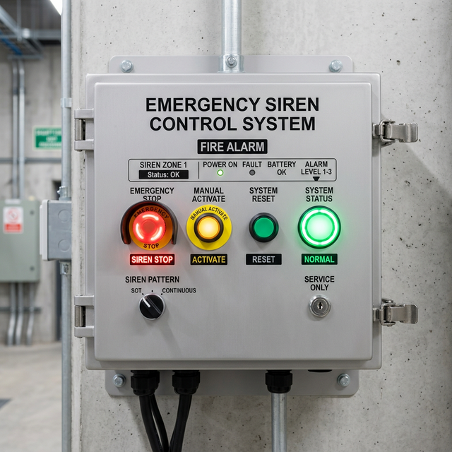 A rugged and highly reliable emergency alert unit designed for industrial plants, public buildings, offices, and disaster management facilities. It provides quick activation of sirens for Fire, Disaster, and All-Clear signals.